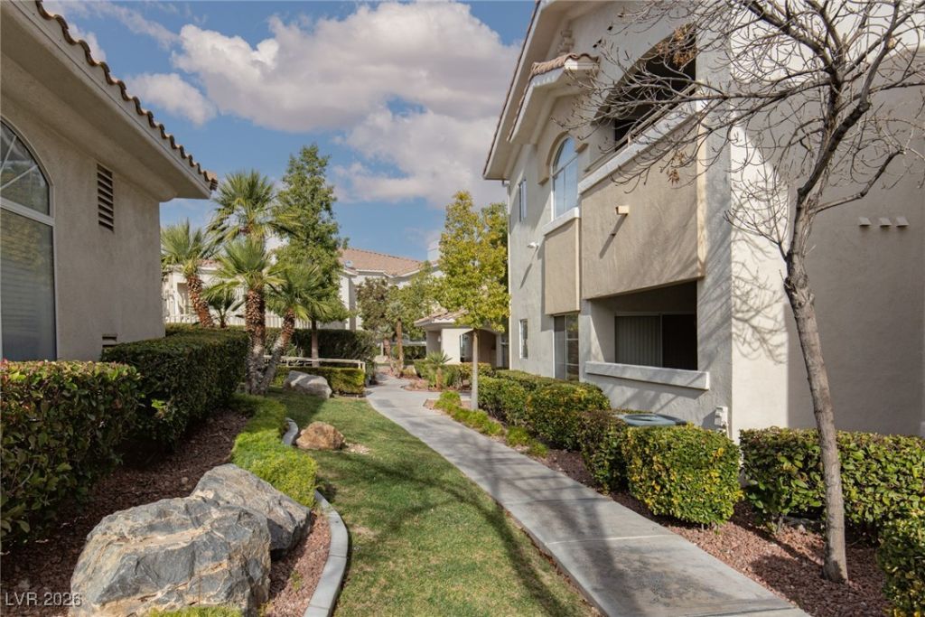 Welcome to this charming 2nd floor unit in a gated Summerlin community that includes a garage. This stunning property offers a perfect blend of comfort and style in a serene, landscaped community setting. Featuring 3 spacious bedrooms and 2 well-appointed bathrooms, this home ensures ample space for relaxation and privacy. The master suite includes an upgraded bathroom with a contemporary vanity and a tiled shower. Enjoy preparing meals in the bright kitchen equipped with modern appliances and plenty of cabinet space. The open-plan living area with wood flooring and a cozy fireplace creates a welcoming atmosphere for entertaining guests. Step out onto the private balcony and savor your morning coffee with picturesque views of the surrounding neighborhood. As part of an exclusive community, residents benefit from access to a refreshing pool/spa, exercise room, well-maintained common areas, and secure entry, enhancing both your comfort and peace of mind.